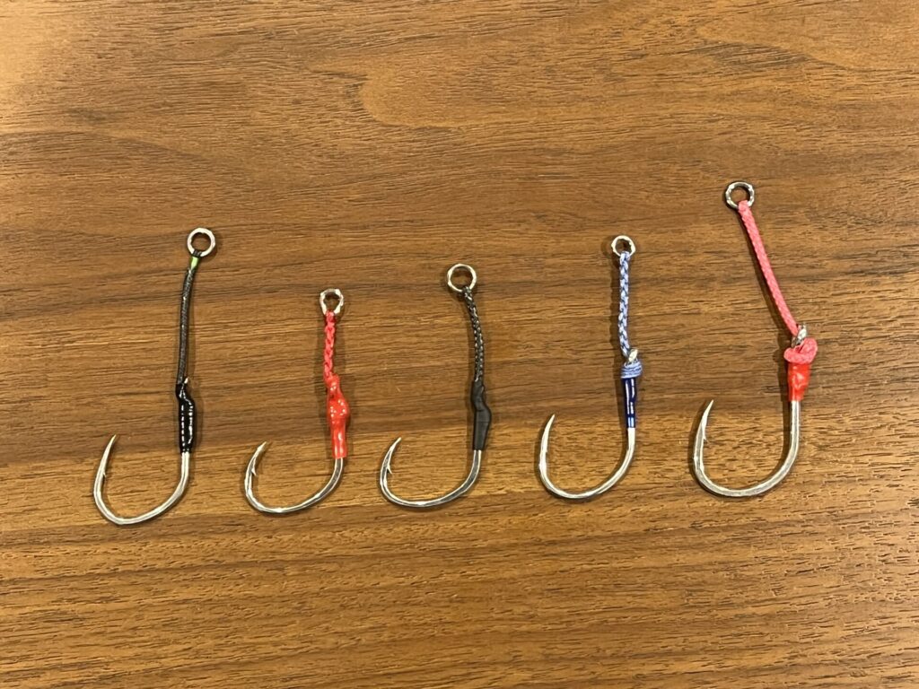 フックの種類はすべてトンジギで多用するシングルアシストフックです。